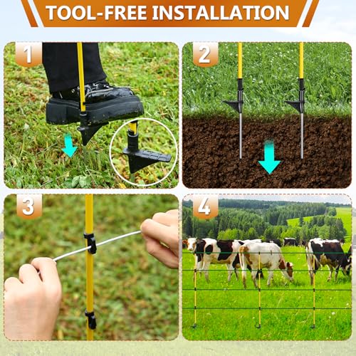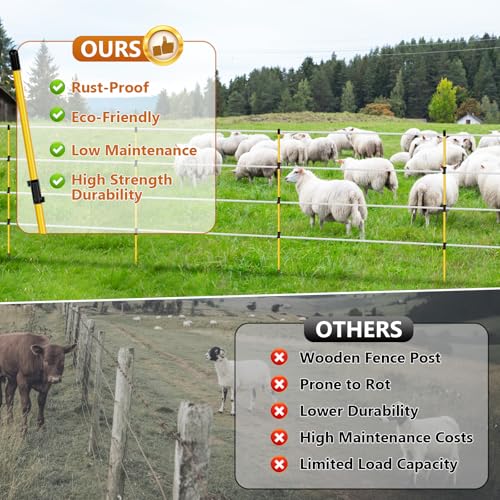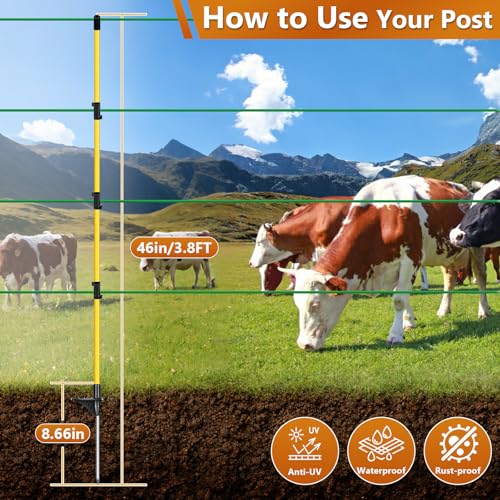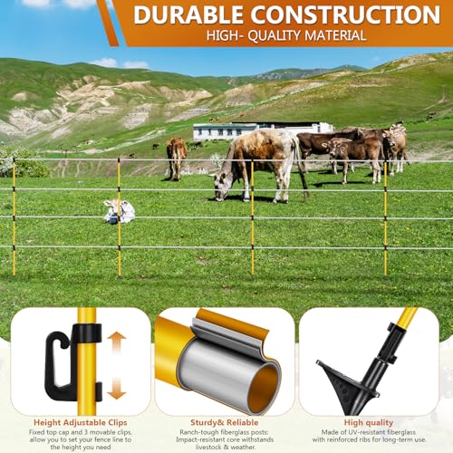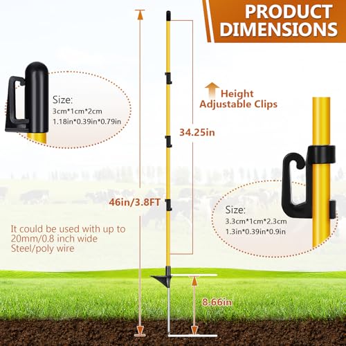 Introducing our high-strength fiberglass electric fence posts, perfect for all your livestock fencing needs. With a total length of 46″—38″ above ground—these durable posts feature a non-conductive design that ensures safety and superior insulation against heat and corrosion. Each pack contains 10 complete posts, with protective caps and 3 integrated wire clips to accommodate tapes up to 5/8″ wide. Ideal for cows, horses, sheep, and poultry enclosures, their sleek design seamlessly blends into your landscape while ensuring secure containment. Rigorously quality inspected before warehousing, our commitment also includes a responsive customer service guarantee within 24 hours for any inquiries.