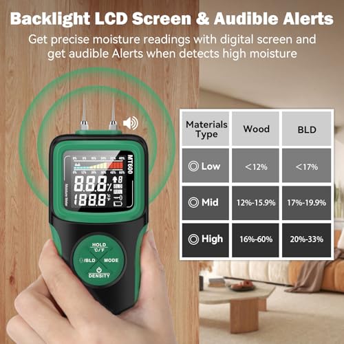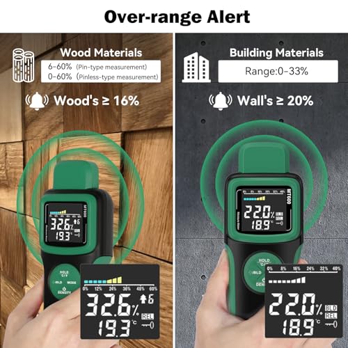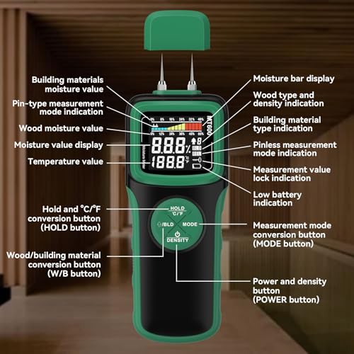 The WOODSAVR wood moisture meter is a versatile and professional tool designed for accurately measuring moisture levels in various materials, including wood and concrete. With both pin and pinless scanning modes, it caters to a wide array of applications, from testing fine wooden surfaces to detecting leaks in walls. Its self-testing function ensures reliability, while high-resolution capabilities detect small moisture changes, helping to assess the suitability of lumber and prevent issues like warping. Ideal for woodworking, home maintenance, and construction, the WOODSAVR delivers precise moisture readings, giving users confidence in their measurements.