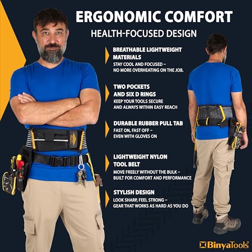 Introducing a uniquely designed lumbar support tool belt that optimizes your carrying experience. It features orthopedic lower back support with 5 integrated stays, effectively reducing strain and evenly distributing weight. The belt itself is lightweight, made from flexible nylon, measuring 2 inches wide and 130cm long, ensuring comfort and durability. An adjustable size helps accommodate various users, with a tension control for heavy tool carrying. Featuring a front pouch equipped with a zipper pocket and a mesh quick-access pocket for your mobile phone, plus multiple D-rings for tools and suspenders, this belt combines practicality with thoughtful design. It’s not just functional but also makes for a perfect gift for Father’s Day or birthdays, especially for grandfathers and tradesmen.