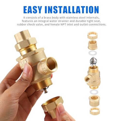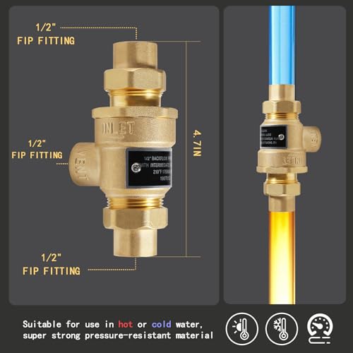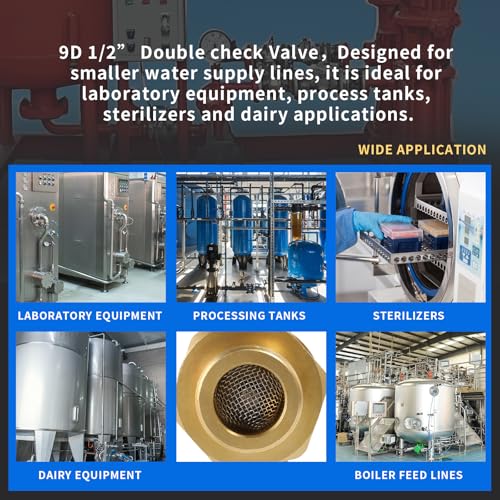 The backflow preventer is a versatile solution for laboratory equipment, processing tanks, sterilizers, and dairy applications, specifically designed for smaller supply lines. It operates efficiently under continuous pressure within a temperature range of 33°F to 210°F and is compatible with all major brands. Constructed with a brass body and stainless steel components, this dual check valve includes an integral filter and durable rubber discs to ensure effective performance. Its design allows installation in both vertical and horizontal orientations, providing flexibility and ensuring the safety of your potable water supply by preventing reverse flow.