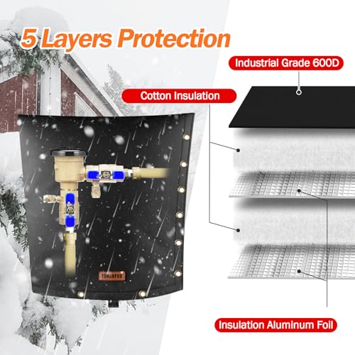 The 5 Layers Design Insulation & Waterproof Backflow Preventer Cover is crafted from heavy-duty 600D Oxford Fabric, cotton insulation, and PE silver coated cloth, ensuring excellent protection against freezing temperatures as low as 5°F. Measuring 20″W x 26″H, it is crucial to measure your device for the perfect fit. This cover prevents costly repairs by shielding your backflow systems from severe weather conditions. It serves multiple purposes, covering various devices like sprinkler systems, irrigation systems, and hose bibs, making it an essential accessory for any outdoor plumbing setup.