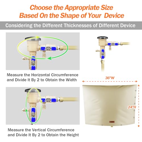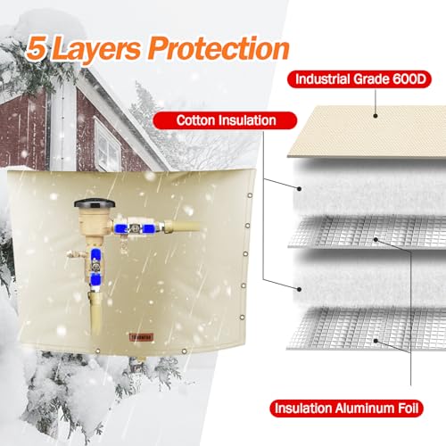 The Backflow Preventer Cover is expertly designed with a 5-layer insulation that includes waterproof heavy-duty 600D Oxford fabric, cotton insulation, and PE silver-coated cloth, ensuring it withstands freezing temperatures as low as 5 degrees Fahrenheit. Measuring 36″W x 24″H, this cover protects against damage from harsh weather, including snow and sun exposure, preventing costly repairs. It features a versatile 2-way opening design suitable for various installations, including sprinkler systems and irrigation setups, making it a multipurpose solution for protecting backflow pipe systems.