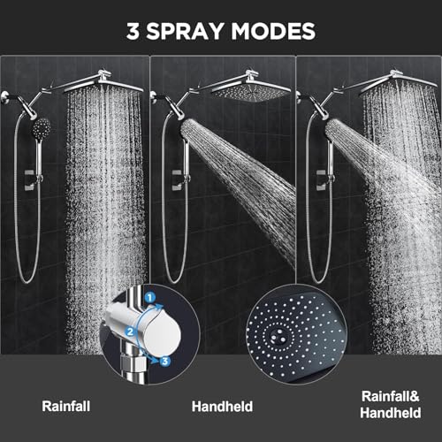 The Luxury Rain Shower Experience offers an 11.8-inch rainfall shower head that transforms your daily shower into a rejuvenating spa escape, providing full-body coverage and consistent water pressure. The Multi-Mode Handheld Spray allows for versatile shower experiences with mist, massage, and rain settings, making it perfect for different needs such as rinsing hair, bathing pets, or cleaning the tub. An Adjustable Extension Arm provides the flexibility to customize shower height and angle, accommodating both tall and short users for personalized comfort. Built with a Durable & Anti-Leak Design using high-quality chrome and innovative technology, it prevents dripping and ensures a long-lasting luxury shower experience.