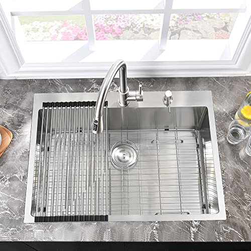 This 25 x 20 drop-in kitchen sink is expertly designed with a spacious and deep profile to prevent splashing and accommodate large pots and dishes, making it ideal for both busy kitchens and laundry rooms. Made from premium 16-gauge T304 stainless steel, it offers excellent resistance to rust, scratches, and stains while ensuring easy cleaning and durability with its satin finish. The seamless construction helps prevent leaks, protecting cabinets from water damage. Notably, the sink features an extra-thick rubber pad underneath that significantly reduces noise from running water and minimizes condensation, safeguarding your cabinets from moisture. Installation is a breeze with its simple drop-in design, making it easy to replace without damaging your countertop. Additionally, the product comes with a satisfaction guarantee and reliable customer service, ensuring peace of mind with your purchase.