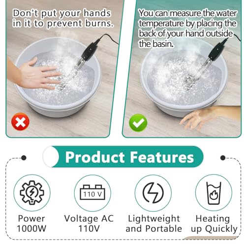 The immersion water heater is crafted from high-quality iron, ensuring durability and lightweight portability. With efficient heating capabilities of 110V and 1000W, it quickly warms up 5 gallons of water in minutes, making it ideal for various heating needs. Simple to operate, simply submerge it in water, plug it in, and monitor the temperature. This versatile device is perfect for heating water for indoor and outdoor use, including beverages like coffee and tea.
