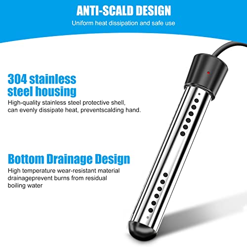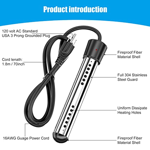 The 2000W immersion water heater is designed for quick heating, capable of heating up to 5 gallons of water in minutes at a voltage of 110-125V AC. It features an LCD digital thermometer for easy temperature monitoring. Made from rust-proof 304 stainless steel, it is safe to use with a protective cover to prevent burns and accidental contact. The design allows for quick heat dissipation, contributing to its efficiency. Key safety instructions include ensuring the heater is fully submerged during use, not exceeding three hours of continuous operation, and keeping it away from other electrical devices to avoid potential hazards. Ideal for camping and home use, this heater combines convenience and safety.