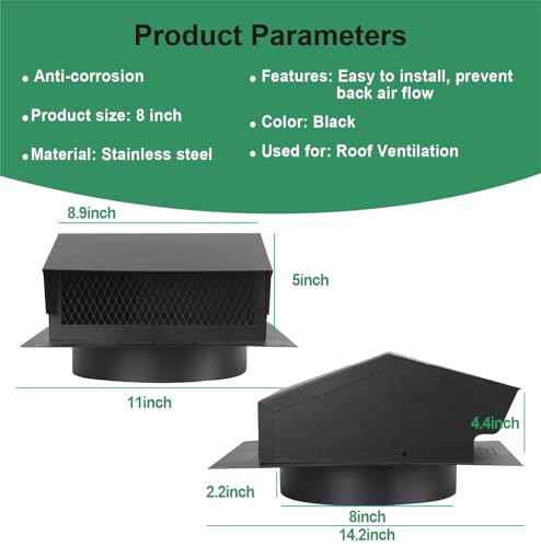 The 8-inch roof vent cap is designed for optimal ventilation performance, effectively circulating fresh air indoors while reducing humidity and odors, making it ideal for bathrooms and kitchens. Its advanced waterproof construction prevents rainwater entry and is resistant to rust due to excellent powder coating. This versatile vent is easy to install with pre-drilled holes, accommodating 8-inch ducts or exhaust fans for improved indoor air circulation. Perfect for various applications, it enhances ventilation and provides protection in use with kitchen and roof exhaust systems.