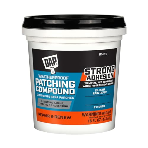 The Weatherproof Patching Compound is an all-purpose filler designed for the installation and repair of various materials including fiber cement siding, PVC trimboard, vinyl siding, and more. Its acrylic latex formula with WeatherMax Technology ensures durability in extreme weather. Fully cured in 24 hours, it is sandable, paintable, and provides a tough, waterproof repair that resists swelling and deterioration.