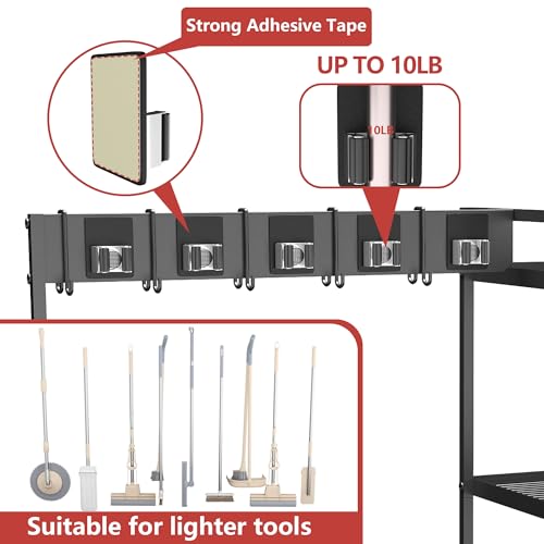 The cleaning cart is designed with multiple features that improve efficiency and ease of use. Its gripper installation system, capable of holding up to 10 lb, allows for convenient storage of lightweight cleaning tools like brooms and mops. To ensure proper adhesion, it’s essential to clean surfaces before applying the grippers and allow them to set for 24 hours. The cart offers effortless mobility with six wheels, three of which have locking brakes for stability. Perfectly sized for small spaces at 42.9″x12.8″x32.3″, it can fit into tight spots while maximizing storage capacity. Ideal for homes and professionals who need a practical space-saving solution.