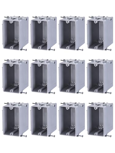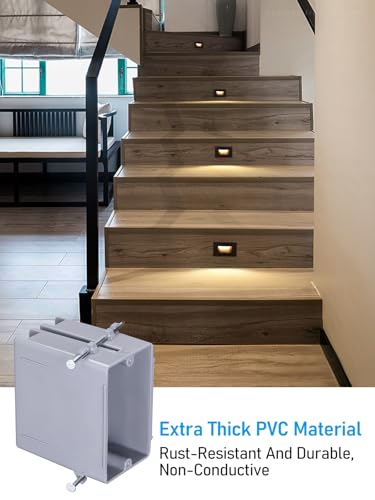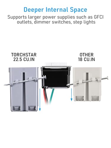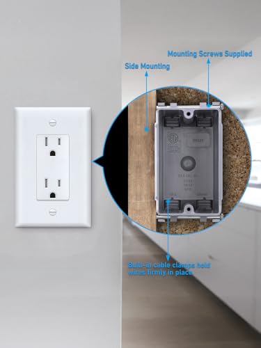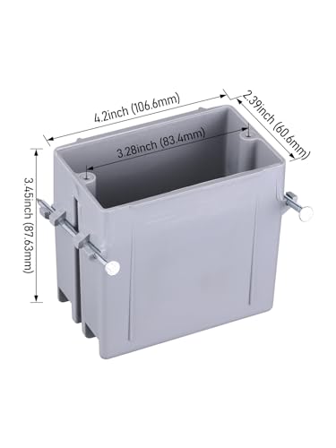 The electrical outlet box is designed for new work applications, featuring side-mounted installation on fixed points, which facilitates easy placement and room layout planning. With an internal space of 22.5 cubic inches, it accommodates larger power devices like GFCI outlets, dimmer switches, and step lights while securely holding wires with built-in cable clamps. ETL Listed and compliant with Article 314 of the National Electrical Code, this box measures 4 3/16 inches in length, 2 3/8 inches in width, and 3 7/16 inches in depth, making it ideal for standard devices and switches with 3-1/4 inch screw spacing.