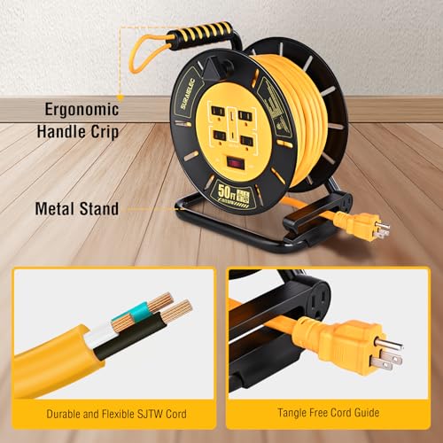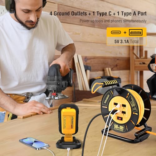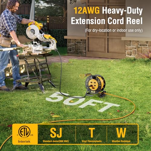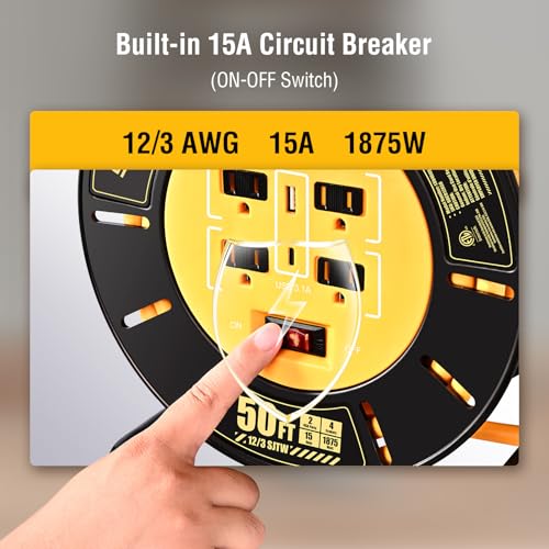 The extension cord reel offers excellent features for power accessibility and convenience. It includes a 50FT cord with four outlets and two USB ports, enabling the powering of multiple devices simultaneously. The heavy-duty 12AWG construction ensures safe use for high-power tools, making it perfect for jobsites and workshops. The retractable design with a smooth hand crank promotes easy, tangle-free storage and mobility. Additionally, it is ETL Listed for safety, suitable for both indoor and outdoor dry locations, providing robust and reliable power for various applications.
