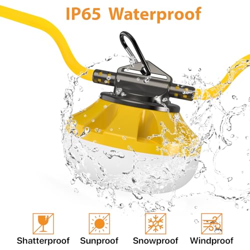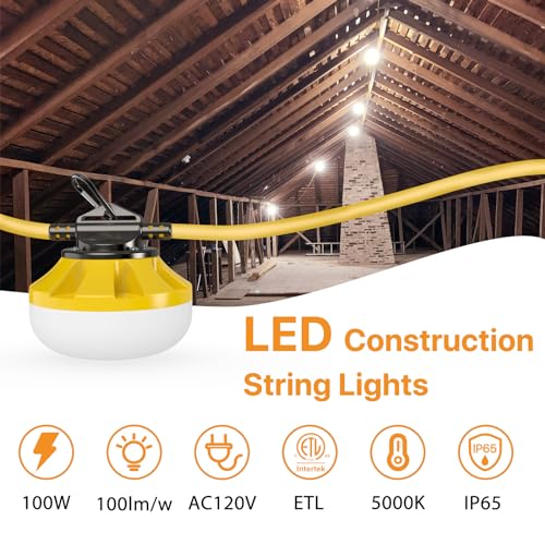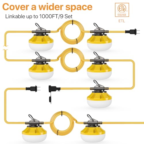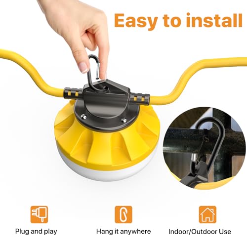This powerful LED construction string light emits 10,000 lumens of bright, 5000K white light, making it perfect for large areas. It is easy to install with a plug-and-play design supporting AC120V and features a waterproof rating of IP65, ensuring safe outdoor use. The flexible setup allows for linking up to 9 sets with 10FT spacing between bulbs, facilitating customized lighting arrangements. Backed by a 3-year warranty, this product also includes after-sales support for peace of mind.