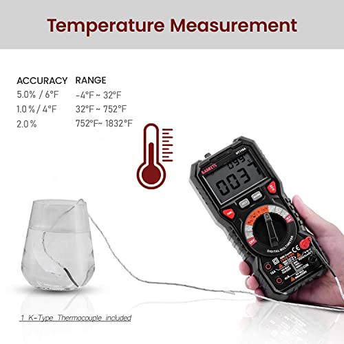 The KAIWEETS HT118A Multimeter is a versatile electrical tool designed for a wide range of applications. It measures up to 1000V DC and 750V AC voltage, as well as 10A AC/DC current and 60 MOhms resistance. This multimeter also provides features such as temperature testing, capacitance, frequency, duty-cycle measurements, and diode continuity tests. Users will appreciate the ease of operation with a simple dial for switching functions and autoranging that negates the need to select specific measurement ranges. The large 2.9” LCD backlit display features 6000-count resolution, enhancing readability even in low-light environments. Additional functions include non-contact voltage testing, sound and light alarms, and a stable kickstand for hands-free use. The multimeter comes with a 36-month after-sale service and lifetime technical support. It includes necessary accessories like test leads, a thermocouple, batteries, and a user manual, ensuring you have everything needed to get started.