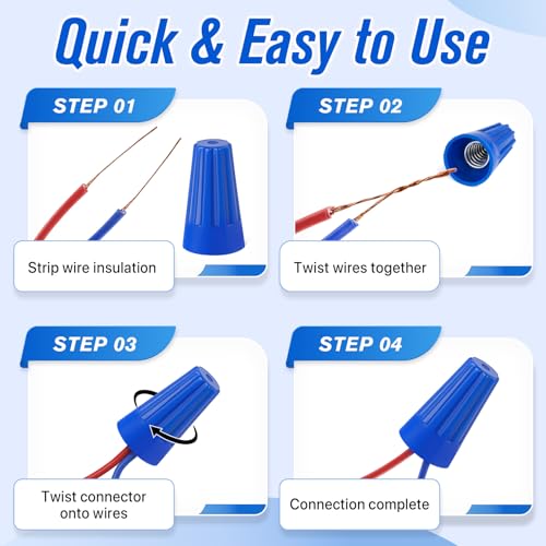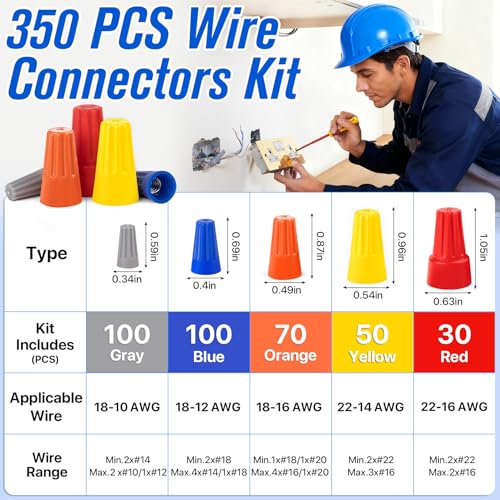 The Wire Nut Connector Kit provides a comprehensive selection of 350 wire caps in various sizes: 100 Grey, 100 Blue, 70 Orange, 50 Yellow, and 30 Red. Constructed from premium nylon and metal springs, these connectors ensure reliable performance and enhanced safety. They suit a wide range of applications, from home wiring to automotive projects, making them versatile for both residential and commercial use. The variety of colors allows for easy identification and selection, simplifying installation and storage.