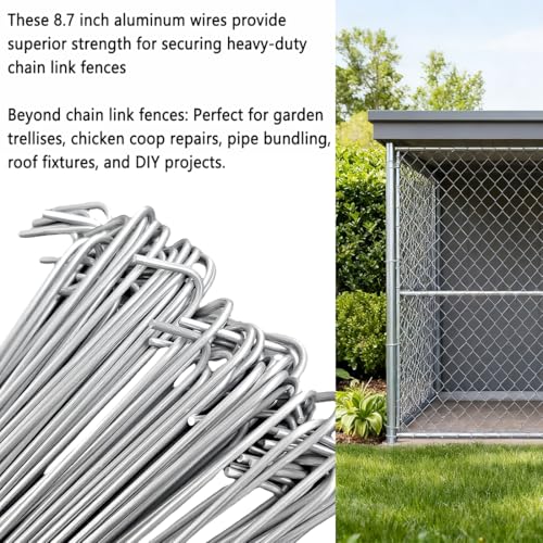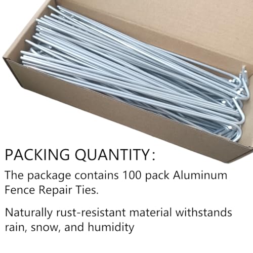 The Aluminum Fence Repair Ties come in a convenient pack of 100, providing ample supply for various outdoor fencing needs. At a premium thickness of 3mm (approximately 11 gauge), these ties are stronger than the standard 12.5g or 14g options, making them ideal for securing heavy-duty chain link fences. Crafted from long-lasting aluminum, they are naturally rust-resistant, ensuring durability against the elements without needing any protective coating. These versatile ties are not only suitable for chain link fencing but also perfect for other applications like garden trellises, chicken coop repairs, pipe bundling, roof fixtures, and various DIY projects. With superior strength and multi-scenario applications, they are a dependable solution for over ten outdoor needs.