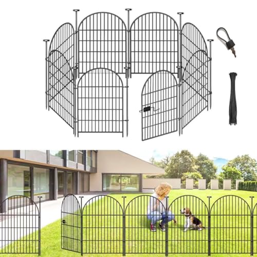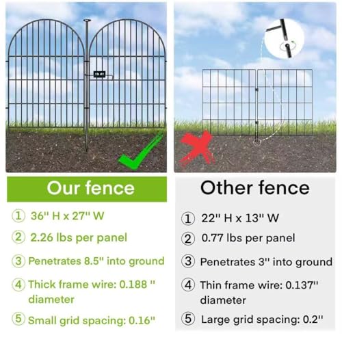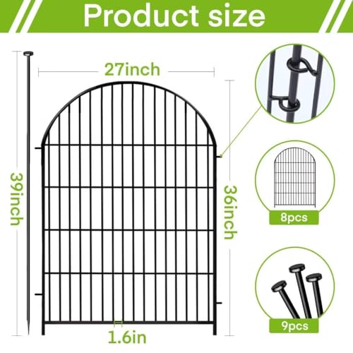 The Higher Fashion Fence offers a classic arched design, ideal for enhancing the beauty of your garden. Each panel stands 36 inches tall and 27 inches wide, with a total length of 17.5 feet for 8 panels. Made from thick, welded iron wire with a black rustproof coating, it provides exceptional strength and durability. The fence is designed for animal defense, featuring a deeper installation for resistance. It is easy to install with sharp-ended metal poles, eliminating the need for screws or hammers. This multifaceted fence serves various purposes, including garden borders and animal barriers, and includes a gate for easy access. Customer satisfaction is a priority, with 24/7 support available for any issues.