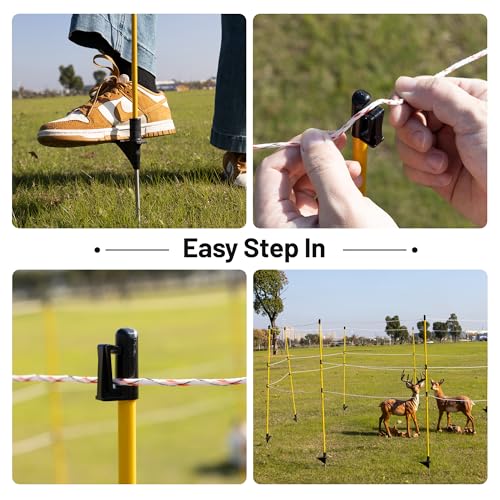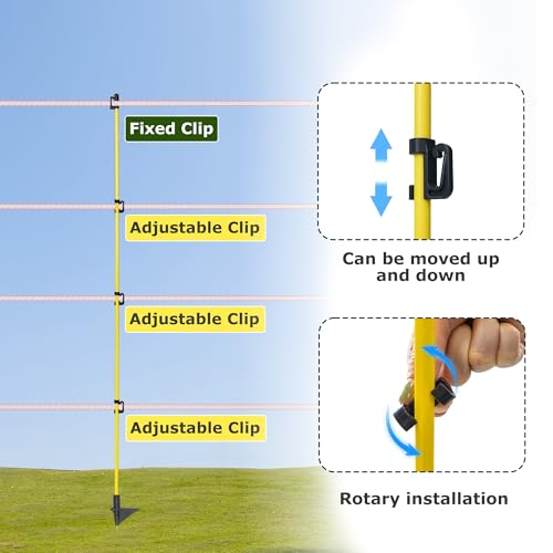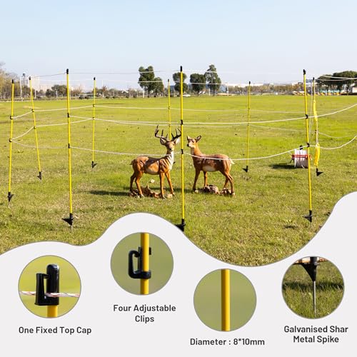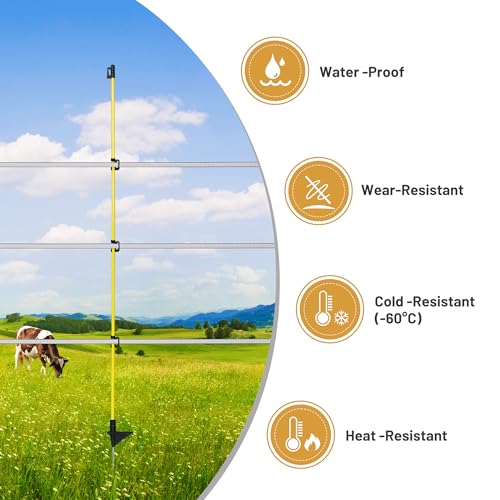 Introducing our versatile Electric Fence Posts, designed for durability and convenience. With a total length of 46 inches and an above-ground height of 38 inches, these posts feature free height adjustment through a fixed top cap and three movable clips. Constructed from lightweight fiberglass for rust and corrosion resistance, they measure 8*10mm in diameter and are equipped with an iron head for stability. Ideal for various applications such as gardening, farming, boundary line marking, crowd control, and livestock management including sheep and cattle.