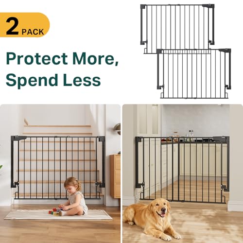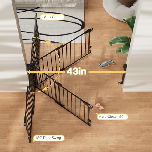 The secure hardware-mounted installation baby gate is designed for maximum stability and safety, particularly at the top of stairs. It fits openings from 29.2 to 43 inches, making it versatile for various doorways and hallways. Its no bottom bar design prevents tripping hazards, providing easy access. The gate can be operated with one hand, perfect for busy parents. Please note that it requires secure mounting; it’s not suitable for metal surfaces and should be anchored into studs when used with drywall.