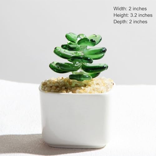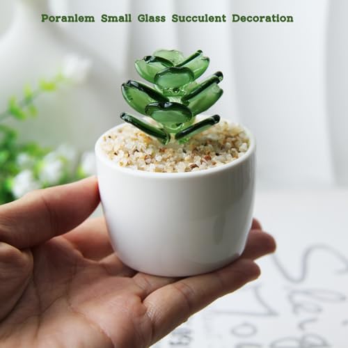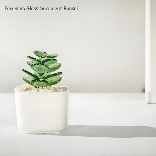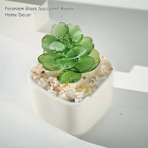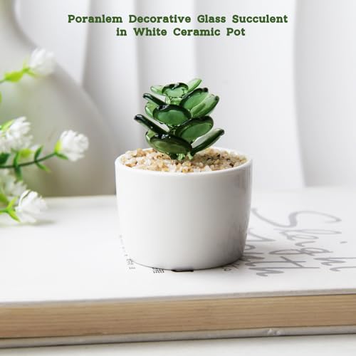 Poranlem Decorative Glass Succulent in White Ceramic Pot Desktop Ornament Home Decor Height 3″ Plant Bonsai Figurine Decoration Gift for Succulent Lovers Modern Home Aesthetics (Green)