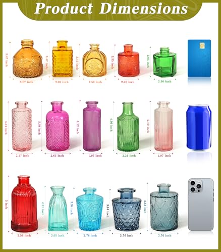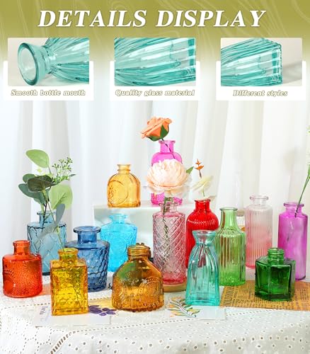 This set of 15 unique glass bud vases showcases beautiful textured designs, ensuring that no two vases are alike. Each vase ranges in height from 3 to 5.1 inches and is crafted from premium thick glass, making them durable and resistant to chips and cracks. Their antique-inspired shapes and colors make them versatile for various decor styles, including farmhouse and modern aesthetics. Ideal for gifting on special occasions like Mother’s Day or weddings, these vases add a touch of elegance to any setting.