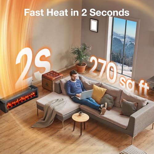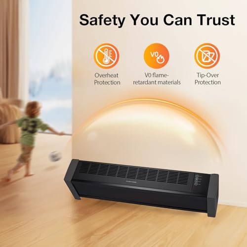 The portable baseboard heater offers an efficient heating solution with its powerful 1500W output, capable of heating spaces up to 270 sq.ft. in just 2 seconds. Designed with a fanless operation, it ensures quieter heating but may provide a gentler warmth compared to fan-based models. The adjustable thermostat features two power modes (700W and 1500W) with a temperature range of 59℉ to 99℉, allowing for easy settings via remote control or LED touch screen. Safety is prioritized with features like a tip-over protection system, V0 flame-retardant materials, and overheat protection. However, it is important to keep it off carpets and avoid direct contact with the hot top outlet.