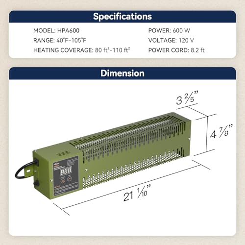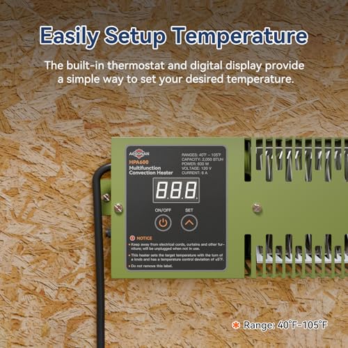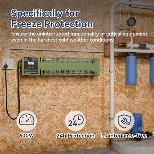 The AEGONAN electric pumphouse and utility heater is designed specifically for freeze protection, ensuring critical equipment functions well in harsh cold weather. It features a built-in thermostat with a digital display for easy temperature setup between 40°F-105°F. Its efficient X-shaped aluminum fins maximize heat transfer while preventing overheating. Made with powder-coated epoxy steel and aluminum, it resists rust and enhances durability, backed by a 1-year warranty. This heater is ideal for use in pump houses, utility rooms, and remote locations, making it a reliable choice for winter protection.