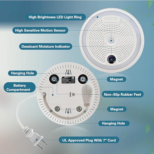 The innovative 2-in-1 Rechargeable Dehumidifier with LED Motion Sensor Light stands out as a must-have home accessory. This ETL approved device combines moisture absorption with lighting, effectively managing humidity in spaces up to 450 cubic feet using advanced 300g silica gel beads. Its eco-friendly design allows for convenient recharging within 8 hours through a built-in plug and 7-inch cord, eliminating the need for disposable dehumidifiers. The motion-sensing LED lights feature three modes, activating high-brightness LEDs for 15 seconds upon detecting motion, which is especially helpful in dark areas like closets or bathrooms. This dehumidifier not only prevents moisture-related issues but also improves visibility when you need it.