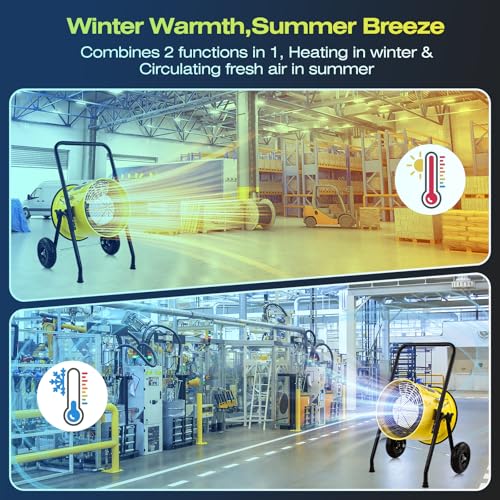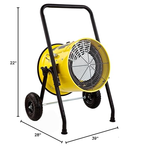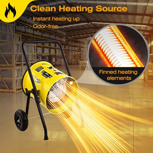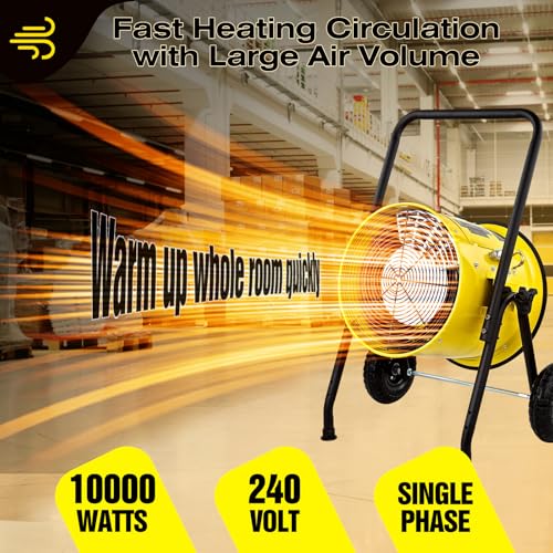 Introducing a powerful electric heater designed for efficiency and safety. This 10,000-watt unit operates on 240 volts and requires a 55-amp circuit breaker for optimal performance. The heater generates clean, instant, and odor-free heat, making it perfect for any indoor setting. Built with a heavy-duty steel frame, it includes safety guards on both intake and output ends for added protection. Additionally, the heater comes with a convenient cart, allowing for easy mobility and placement wherever you need it most. Ideal for workshops, garages, or any large space, this heater combines functionality and safety in one durable package.