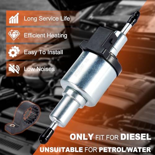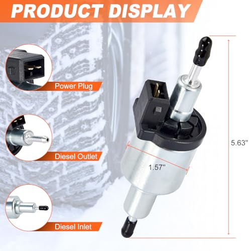 The Carbole 12V diesel heater fuel pump is a robust and efficient component for diesel heating systems. Made from durable aluminum alloy and quality plastic, it ensures reliable performance during continuous operation. This pump is designed to work seamlessly with Webasto and Eberspacher heating systems, catering to diesel heaters ranging from 2KW to 8KW. It features a working voltage of 12V and a fuel volume flow of 0.19-0.25 liters per hour. With dimensions of 5.63 x 1.57 inches, it is a direct-fit replacement that can be easily installed using standard tools, although it’s advisable to check compatibility with your original unit prior to purchase.