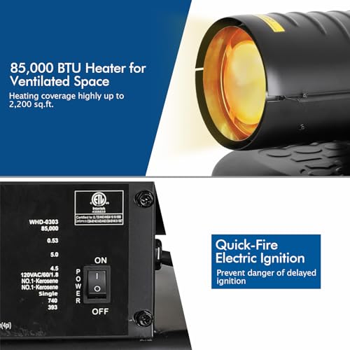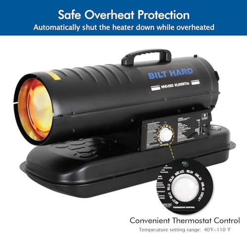 The BILT HARD Kerosene Heater is a powerful multi-fuel forced air heater, delivering 85,000 BTUs and efficiently heating up to 2,200 sq. ft. for 9 hours on just 0.6 gallons of fuel. With its sturdy steel construction, this heater is ideal for both indoor and outdoor uses including construction and agricultural settings. It supports various fuels such as kerosene, diesel, and fuel oil, although K1 kerosene is recommended for optimal performance. Equipped with self-diagnostics, a thermostat, and an indicator lamp, it ensures straightforward operation. Backed by a 1-year warranty, BILT HARD is committed to customer satisfaction with quality service and free exchanges for any product issues.