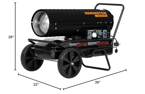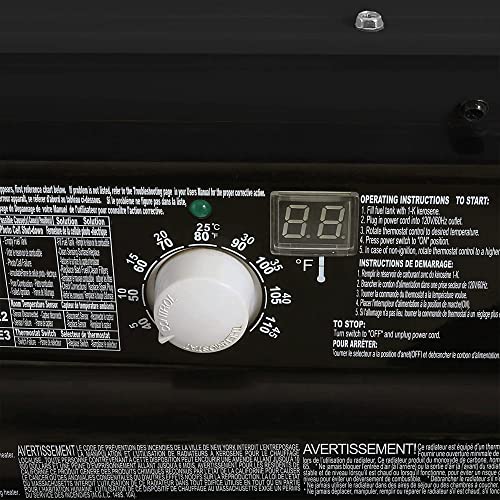 The kerosene heater is a powerful and efficient heating solution, capable of warming spaces up to 3500 square feet for up to ten hours on a full tank. It operates using K-1 kerosene and various diesel fuels, making it versatile. The heater is easy to use; simply fill the tank, plug it in, and enjoy immediate warmth. It has a durable steel construction for lasting performance, complemented by easy lift handles for portability. Safety is a priority, featuring a built-in 5-point safety system, including high-temperature limit shut off, flameout protection, and robust safety guards, ensuring peace of mind while providing heat.