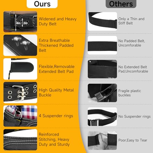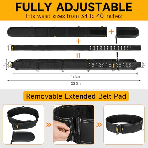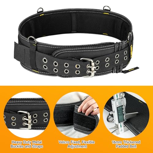 Introducing the Adjustable Tool Belt, designed for comfort and functionality. This durable belt fits waists 34” to 40” and comes with a removable padded belt pad for added comfort. The 4-inch wide padded belt is made from heavy-duty, tear-resistant nylon, reinforced for strength with dual metal roller buckles. Ideal for professionals like electricians, carpenters, and plumbers, this utility belt is compatible with various tool pouches and suspenders, making it a versatile addition to your toolkit. Whether for work or as a gift for a handyman, it’s an essential accessory for any trade.