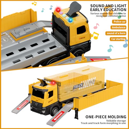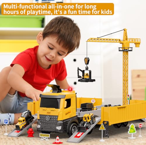 The Multi-Functional Transform Truck Toy offers engaging play with features like dual launch tracks and one-touch ejection. This set includes a variety of construction vehicles such as a crane, excavator, and dump truck, promoting collaborative play. The 3-in-1 carrier semi-trailer truck has a foldable design, sound effects, and ample parking space. It’s an excellent gift for children aged 3 and up, designed to enhance hand-eye coordination and provide fun during playtime.
