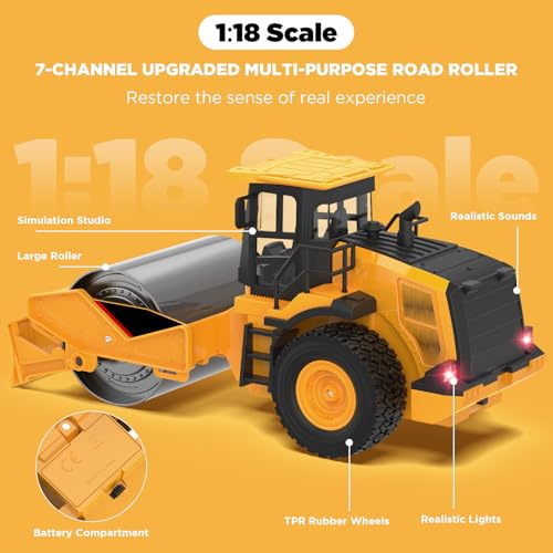 KIDDITOY ㅤ 7-Channel Remote Control Road Roller Toy, [2025 Upgraded] 1:18 Scale Construction Vehicle, 100min Playtime, Realistic Sounds & Lights, Rechargeable, Indoor & Outdoor Play for Kids 6-16