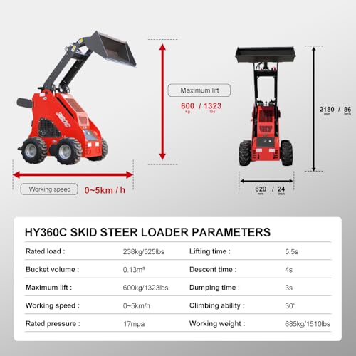 The Skid Steer Loader is a versatile and powerful payloader machine designed for various applications such as drilling, digging, landscaping, and construction. It features a 13.5HP gasoline engine with a 17Mpa hydraulic system, enabling heavy-duty lifting capabilities of up to 600kg. Its efficient operation boasts low fuel consumption, ensuring cost-effectiveness. With quick work cycles, including 5.5 seconds for lifting and 4 seconds for descent, this loader efficiently meets high-demand tasks. Its compact design allows for easy transport and maneuverability in tight spaces, making it ideal for rough terrain and slopes.