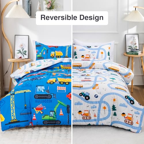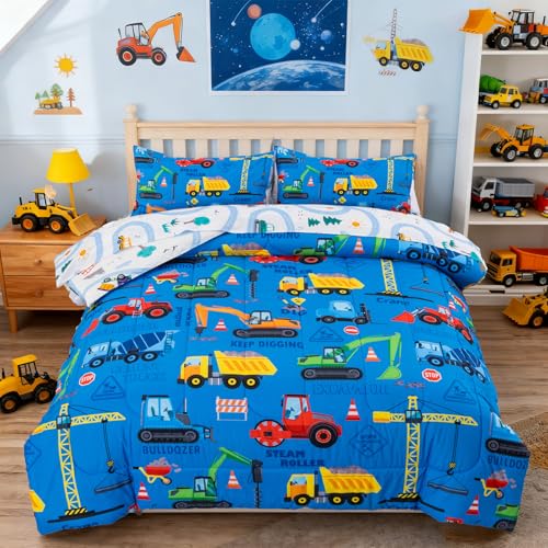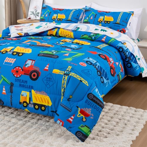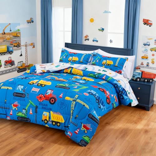 Holawakaka Trucks Excavator Cars Boy Bedding Comforter Set with Sheets, Full Size Cartoon Construction Car Tractor Print Kids Bed in A Bag 5-Piece, Boys Reversible Dorm Bed Sets (Blue Full)