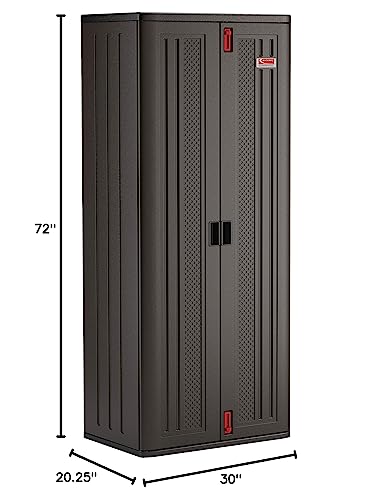 The Tall Storage Cabinet is a versatile and practical solution for organizing your belongings, ideal for garages or indoor use. With its durable multi-wall resin construction, it resists warping, rusting, and denting. The cabinet features lockable polycarbonate handles for added security, allowing you to use standard padlocks (not included). Measuring 20.25″ D x 30″ W x 72″ H, it provides ample storage space while maintaining a compact footprint, making it an excellent choice for those looking to maximize their organizational capacity without compromising space.
