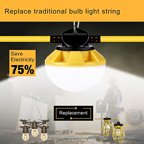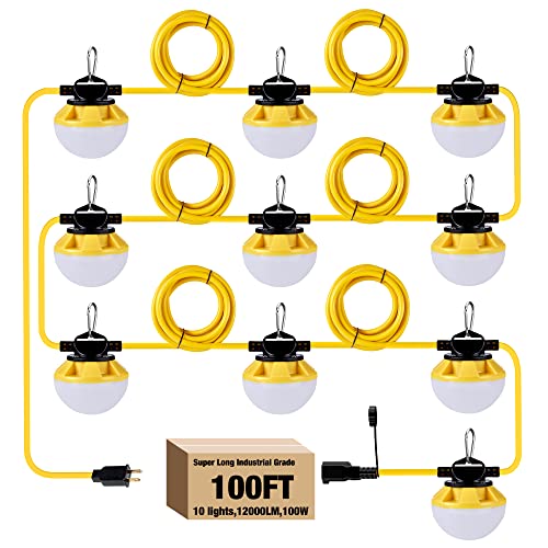 Introducing our Portable and Flexible LED Construction String Lights, designed to revolutionize your temporary lighting needs. With an impressive 12,000 lumens output per set and a 270° wide-angle anti-glare design, these lights ensure soft and adequate illumination for large areas. The kit includes ten climbing hooks and a 100ft power wire, allowing you to tailor the layout to your requirements. Easy to install, simply plug and play for immediate setup, even in outdoor job sites. Enjoy peace of mind with an extended 5-year warranty and an impressive 80,000-hour lifespan, ensuring durability and performance. Perfect for construction sites and outdoor events!