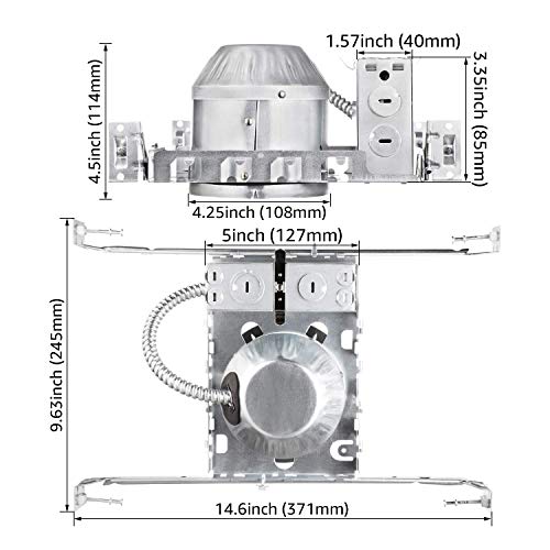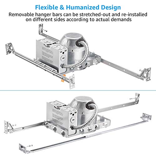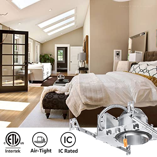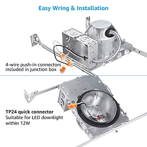 The recessed housing is designed for maximum energy efficiency and versatile installation. Its IC-rated, air-tight design ensures optimal heating and cooling by preventing airflow diffusion and allowing contact with insulation. This 4-inch housing is compatible with 12W recessed lights, making it suitable for various new construction projects. Easy installation is facilitated through push-in connectors and knock-out stampings, paired with high-quality, ETL-listed safety standards. A guide and cut-out template are provided for user convenience.