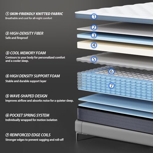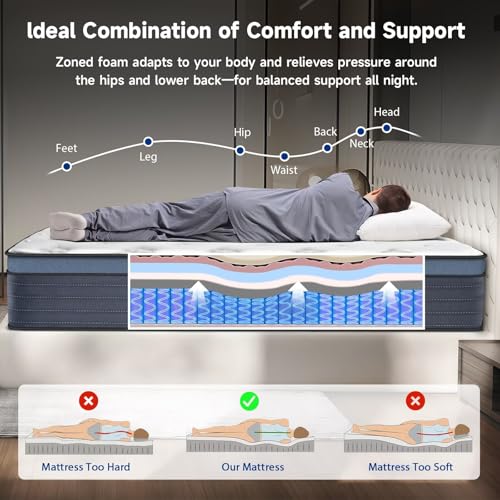 The Luxurious Comfort & Medium Firm Support Hybrid Mattress combines premium memory foam with individually wrapped pocket springs to contour to your body and relieve pressure points. Its enhanced stability and edge support prevent sagging, while quiet sleep features minimize motion transfer, facilitating restful sleep for partners. This mattress comes compressed in a box, is easy to set up, and includes a risk-free 180-night trial and a 10-year warranty, ensuring peace of mind with every purchase.