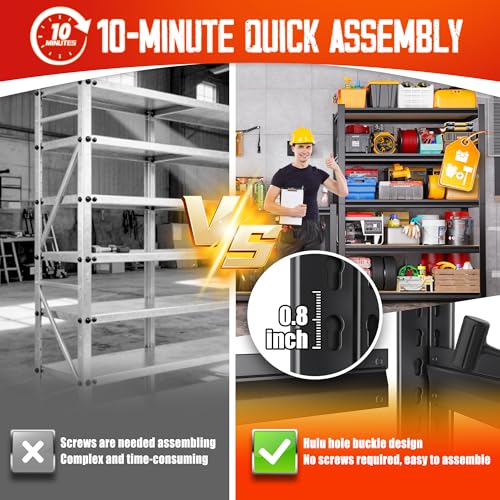 The Sturdy Garage Shelving Unit is designed for exceptional durability and strength, featuring premium steel and high-density MDF boards, allowing for a total load capacity of up to 2,050 lbs. This versatile storage solution can be assembled effortlessly in just 10 minutes, catering to users of all experience levels. With adjustable shelves, it accommodates various item sizes, promoting a more organized living space. Suitable for homes and professional settings, it provides reliable storage for garages, kitchens, and more.