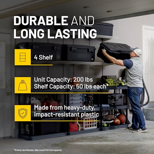 The Plano Plastic Storage Shelves are an excellent choice for organizing various spaces such as your home, garage, closet, laundry room, or office. Each of the four heavy-duty plastic shelves can hold up to 50lbs, accommodating a total weight of 200lbs. Made from impact-resistant plastic, it offers durability and longevity. Measuring 47.5 inches tall, 23 inches long, and 14 inches wide, this shelving unit efficiently maximizes vertical space, while each shelf allows for items up to 13 inches tall. Its tool-free assembly makes it user-friendly and convenient for any environment.