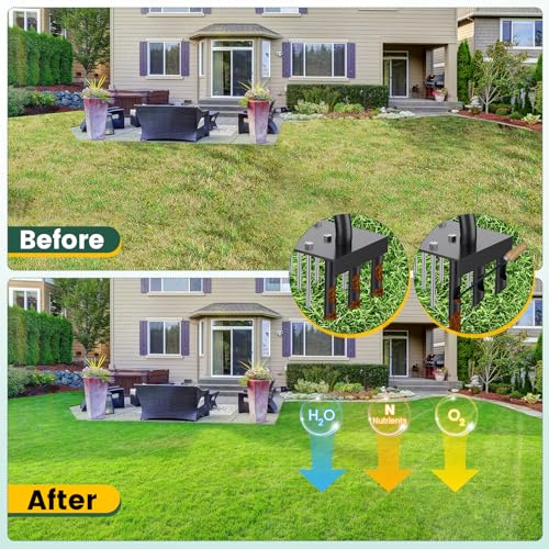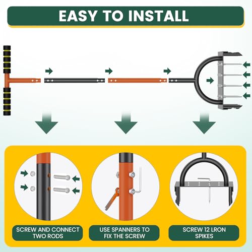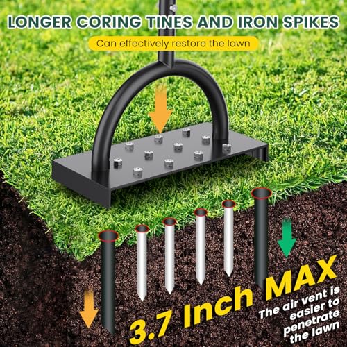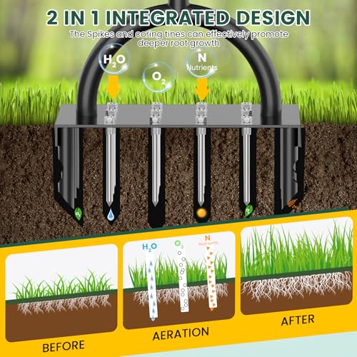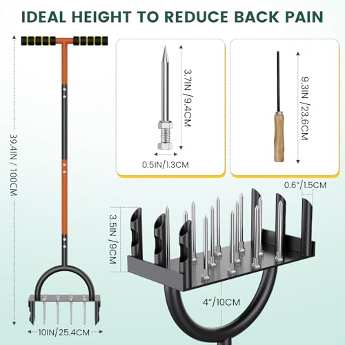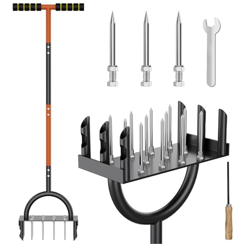 The Hawcay Manual Lawn Aerator is a 2-in-1 multifunctional tool designed for efficient lawn aeration. With 18 spikes that create holes for aeration, it effectively loosens soil to promote plant growth. Constructed from high-strength carbon steel, it resists wear and rust. Its ergonomic height of 39.4 inches allows for comfortable use without straining the back. The spikes reach 3.7 inches deep, breaking soil compaction and facilitating nutrient access. The larger foot plate and cushioned T-handle enhance comfort during long sessions. For best results, soil should be pre-soaked, ensuring your lawn thrives beautifully.