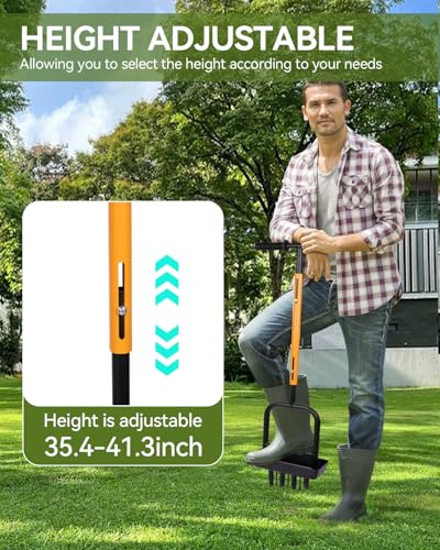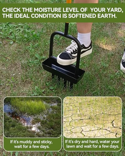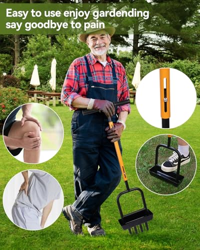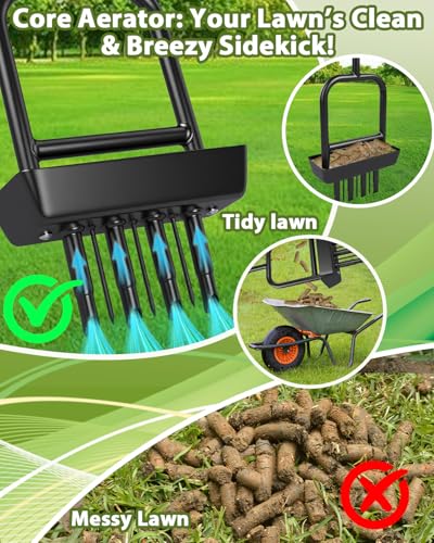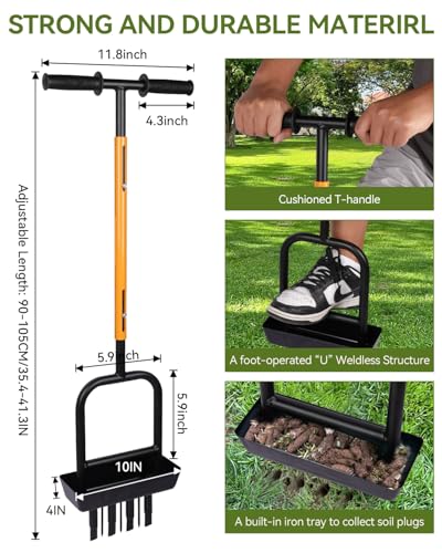 The Manual Lawn Aerator Tool is designed for efficient aeration, featuring a combination of 4 core ventilation spikes and 3 solid spikes to enhance soil breathability and nutrient absorption for healthy plant growth. Its one-inch diameter spikes help prevent clogging, and a cleaning tool is included for easy maintenance. The aerator comes with a Soil Core Storage Tray that collects soil cores, ensuring an organized cleanup process. With adjustable height from 35.4 to 41.3 inches to accommodate users of different heights, its wider foot design allows for easy use even with work boots. The soft rubber handle enhances comfort and reduces fatigue during use. It is advisable to soften soil ahead of aeration after rainfall or when the ground is hard, leading to a more effective aeration process.