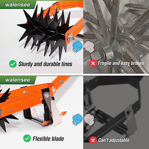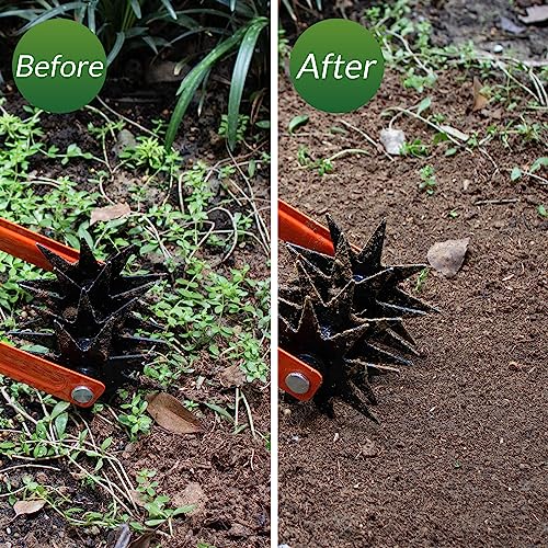 The Walensee Garden Cultivator Tool is designed for gardening enthusiasts, featuring a unique star-shaped head and a rolling mechanism that efficiently breaks soil. Its four interlocking gears with 9 teeth enhance effectiveness, while the star-shaped wheels ensure fine soil texture. The cultivator includes a durable manganese steel weeding knife for simultaneous weeding, with flexible angles for improved digging. The ergonomically designed, adjustable rubber handle ensures comfort during extended use, reducing hand strain. Made with corrosion-proof stainless steel, this cultivator is built to last. Walensee guarantees 100% satisfaction, offering a full refund if not satisfied.