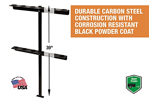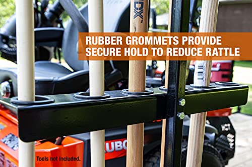 The versatile tool rack for open-style trailers is designed for heavy-duty use, securely mounting to trailer rails and accommodating up to six straight-handle tools (not included). Its rubber grommets ensure tools stay in place during transport, protecting your equipment. The rack maximizes vertical storage space, keeping tools organized and accessible, and offers multi-surface mounting options for use with trailers, walls, workbenches, or utility vehicles, making it ideal for garages, sheds, or on-the-go landscaping and construction projects.