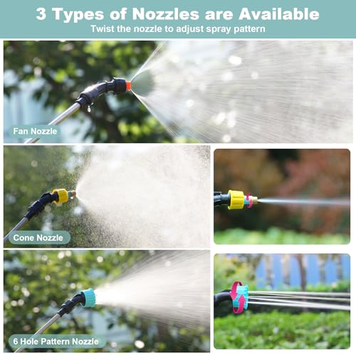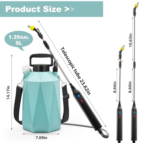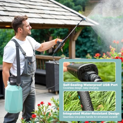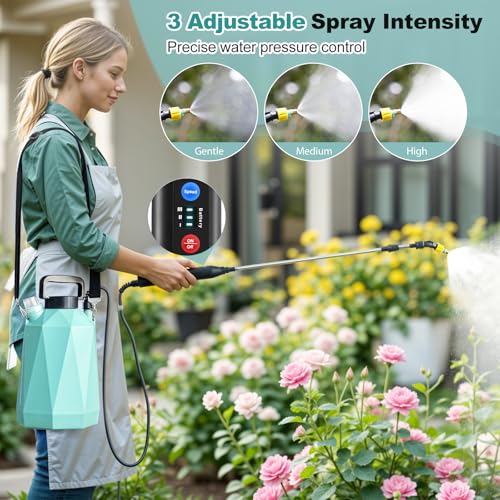 The 1.35-Gallon All-Power Sprayer stands out with its 3-level adjustable spray intensity—Low, Medium, and High—making it suitable for various tasks like weed control and garden watering. Its IPX4 waterproof rating and corrosion-resistant body ensure durability. The real-time battery indicator prevents unexpected shutdowns, providing 2-3 hours of continuous spray time for larger areas. With versatile nozzles and a telescopic wand extending to 23.6 inches, it’s user-friendly and reaches difficult spots easily. Lightweight with an adjustable shoulder strap, it’s designed for comfort during prolonged use. Backed by a 12-month warranty and 24/7 customer support, this sprayer combines efficiency and reliability for all your landscaping needs.