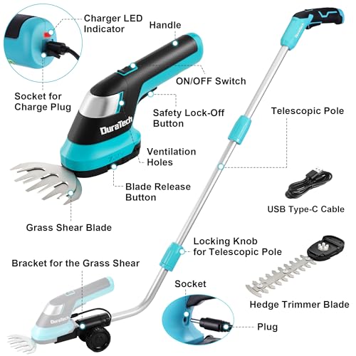 DURATECH Cordless Hedge Trimmer, 7.2V 3-in-1 Handheld Electric Grass Trimmer & Hedge Shears with 50″ Wheeled Extension Pole, USB Type-C Cable and Built-in Li-ion Battery, for Garden, Yard and Lawn