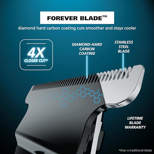 The 360 Extreme Visibility Trimmer features an exposed skeleton design that ensures a clear line of sight for precise trimming. It comes with three attachment heads: the DLC T-Blade, Rotary Nose Trimmer, and Dual Foil Shaver, each easily interchangeable with a thumb screw. The Forever Blade boasts a Black Diamond Hard Carbon Coating, resulting in smoother cuts and cooler operation, along with a near zero gap design for an exceptionally close trim. Additionally, this trimmer is fully waterproof, allowing for convenient use in the shower and easy cleaning.