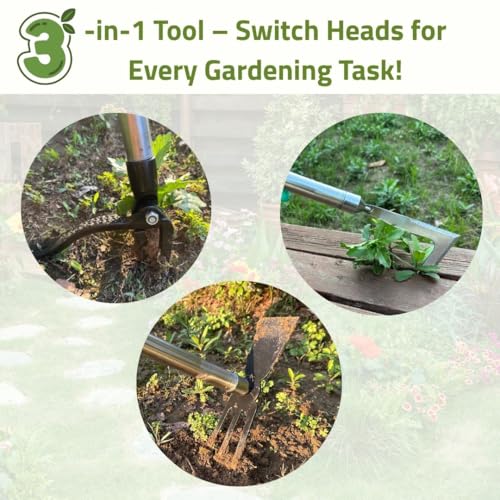 Introducing the versatile 3-in-1 Weeding Tool Set, designed to simplify your gardening tasks with three interchangeable heads: a stand-up weed puller for minimizing strain, an edger blade for tidy lawn borders, and a sharp weeding hoe that tackles every type of weed. Its stand-up design prevents back pain, making it a comfortable choice for all gardeners. Switching between heads is hassle-free, requiring no tools, which is perfect for reaching tight corners and various garden types. Whether you’re maintaining lawns, flower beds, or even pavement, this tool efficiently handles all your weeding needs, showcasing durability and convenience.